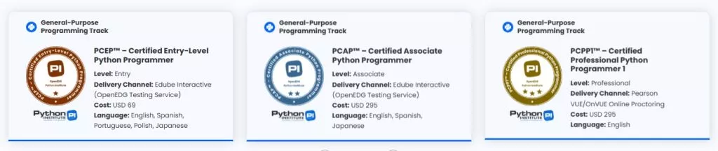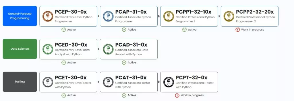 Python Institute oferuje następujące niezależne i niezależne od dostawców certyfikaty z języka programowania Python w ramach ścieżki Programowanie ogólne: