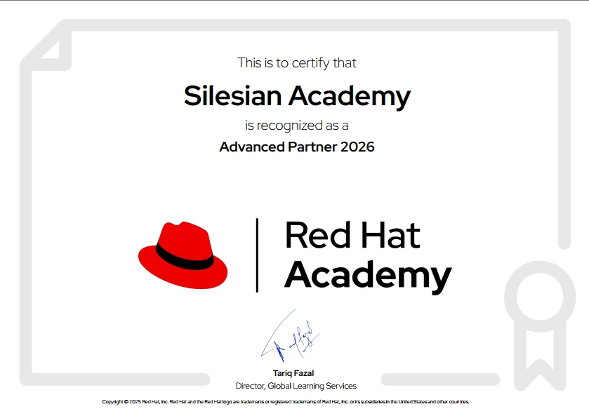 Z radością informujemy o uzyskaniu wyższego statusu Red Hat Academy jako Advanced Partner 2026 w programie Red Hat Academy Excellence. Mamy teraz prawo do szeregu korzyści np. darmowych egzaminów certyfikujących oraz szkoleń dla studentów i instruktorów w tym innych aktywności, które określa program dla Partnerów Advanced. Głównym założeniem jest wspieranie rozwoju umiejętności Red Hat i zwiększanie możliwości uczenia się dla studentów i instruktorów.