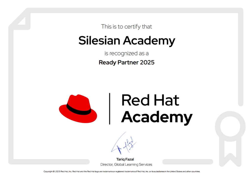 Z radością informujemy o uzyskaniu wyższego statusu Red Hat Academy jako Ready Tier w programie Red Hat Academy Excellence. Program odzwierciedla sukces w zaangażowaniu, wynikach studentów i przyjęciu samego programu. Uzyskane wyróżnienie podkreśla dostosowanie do wysokich standardów programu, z czego jesteśmy bardzo zadowoleni i przygotowani do pracy w tej przestrzeni z obecnymi i przyszłymi studentami.