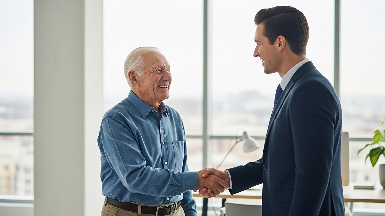 Dwóch mężczyzn w biurze podaje sobie dłonie i uśmiecha się, symbolizując współpracę i zaufanie