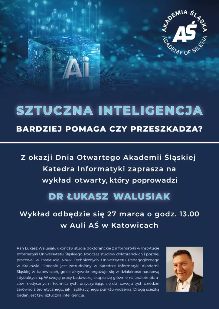 Pan Łukasz Walusiak, ukończył studia doktoranckie z informatyki na Instytucie Informatyki Uniwersytetu Śląskiego. Podczas studiów doktoranckich i później pracował w Instytucie Nauk Technicznych Uniwersytetu Pedagogicznego w Krakowie. Obecnie jest zatrudniony w Katedrze Informatyki Akademii Śląskiej w Katowicach, gdzie aktywnie angażuje się w działalność naukową i dydaktyczną. W swojej pracy badawczej skupia się głównie na analizie obrazów medycznych i technicznych, przyczyniając się do rozwoju tych dziedzin zarówno z teoretycznego, jak i aplikacyjnego punktu widzenia. Drugą ścieżką badań jest tzw. sztuczna inteligencja.